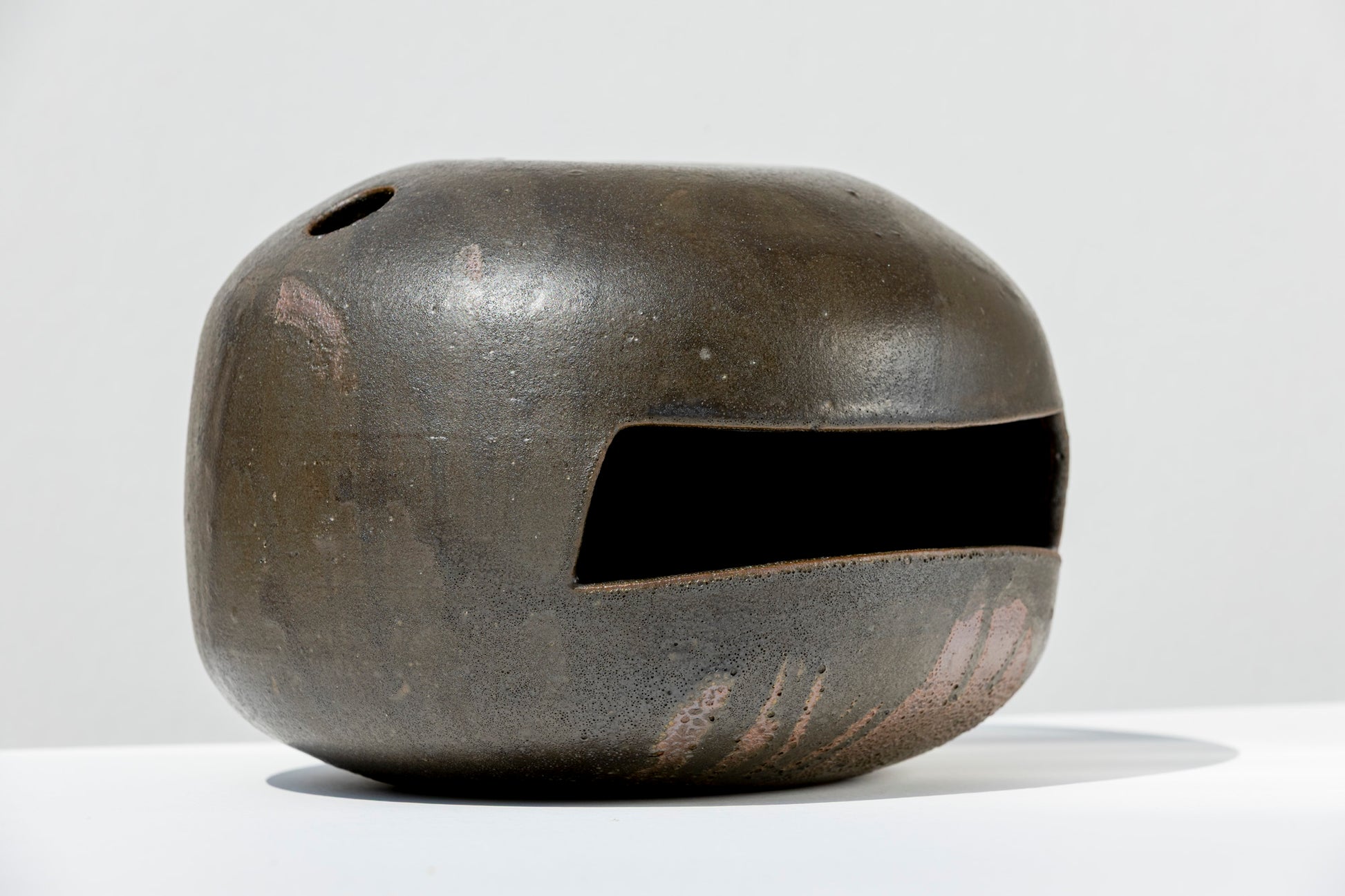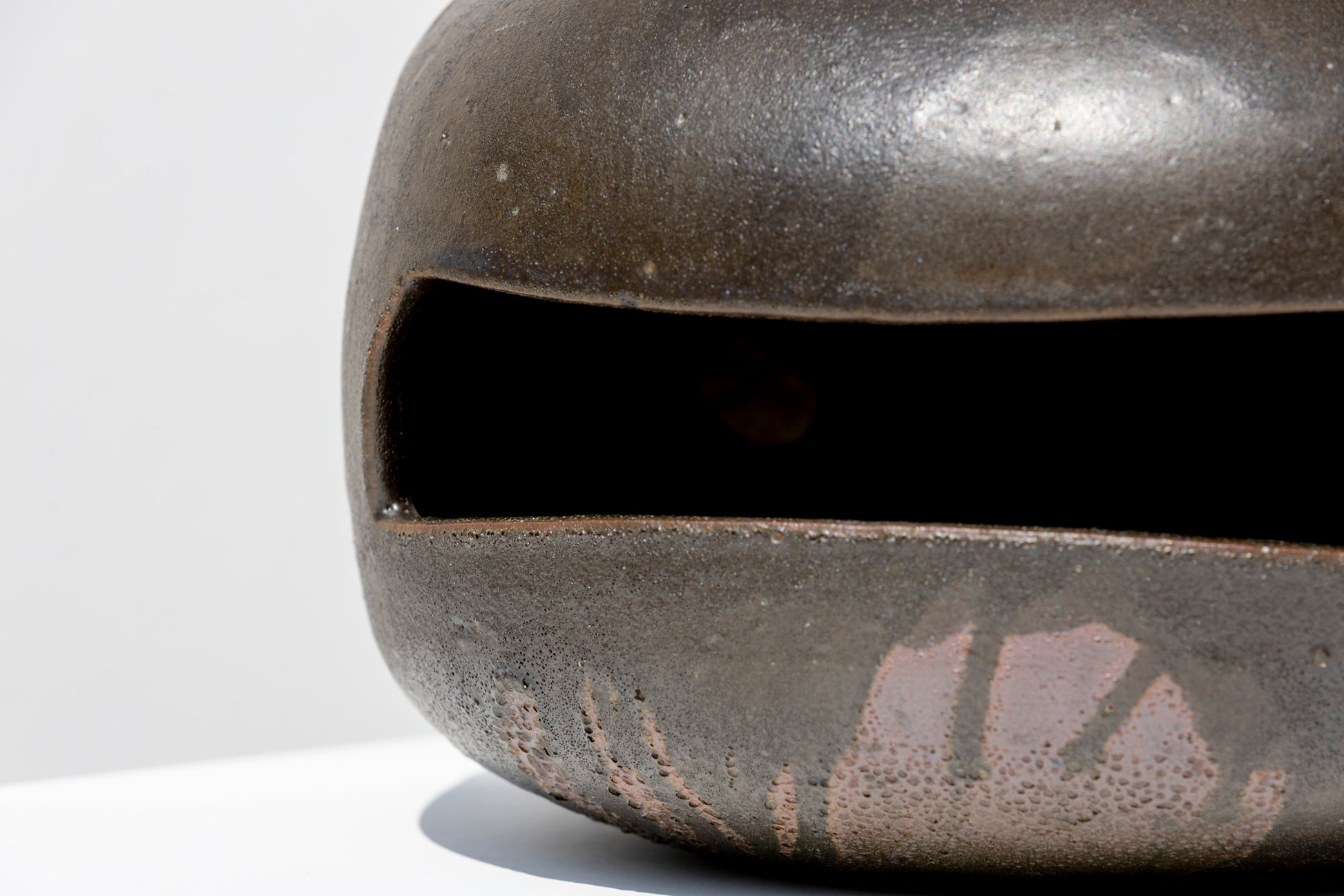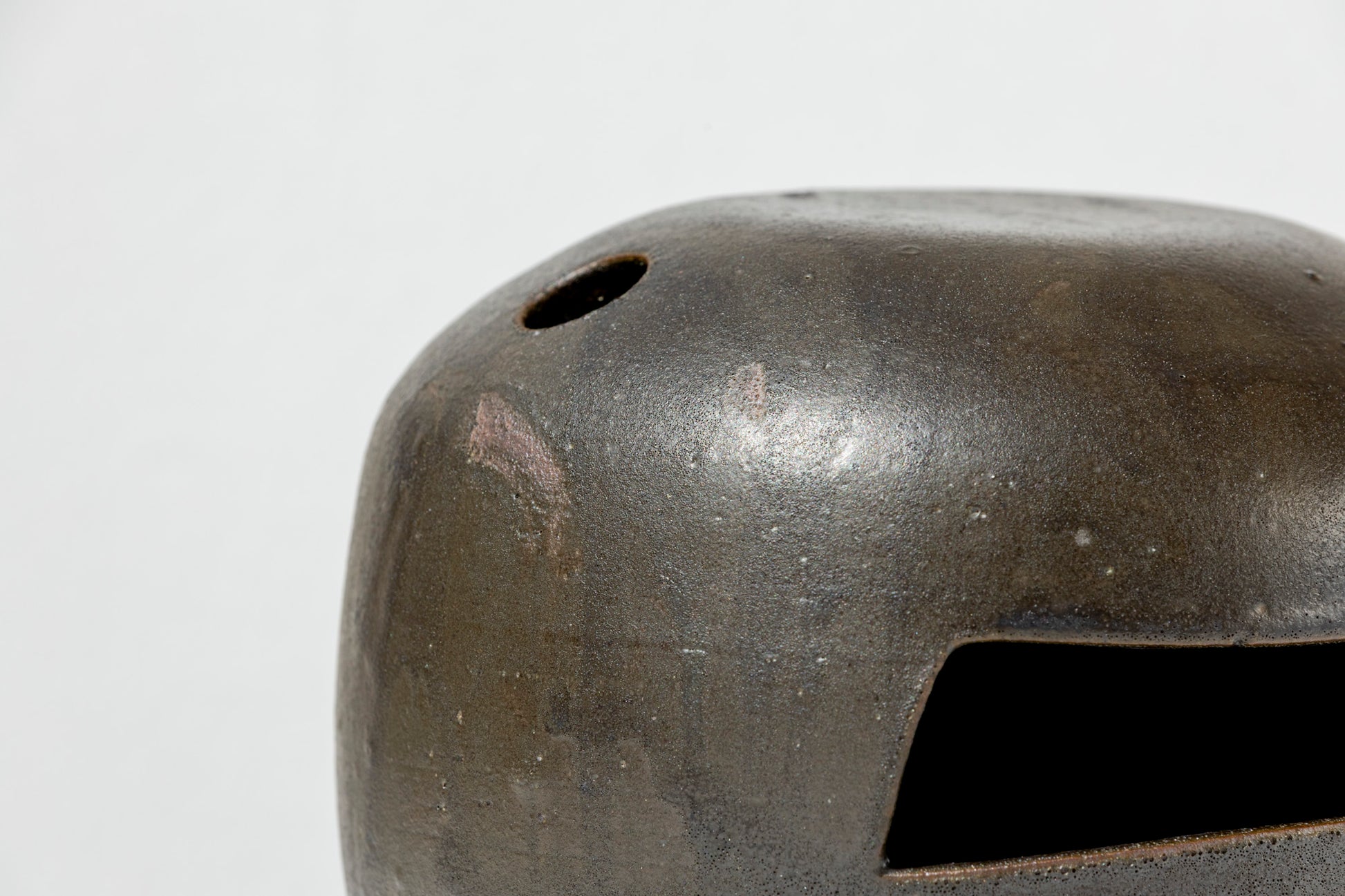 A vessel that blurs the line between function and form. This stoneware vase features a rounded silhouette punctuated by geometric openings. Its matte black glazed surface carries subtle variations from the firing process, lending it a raw, almost volcanic character.