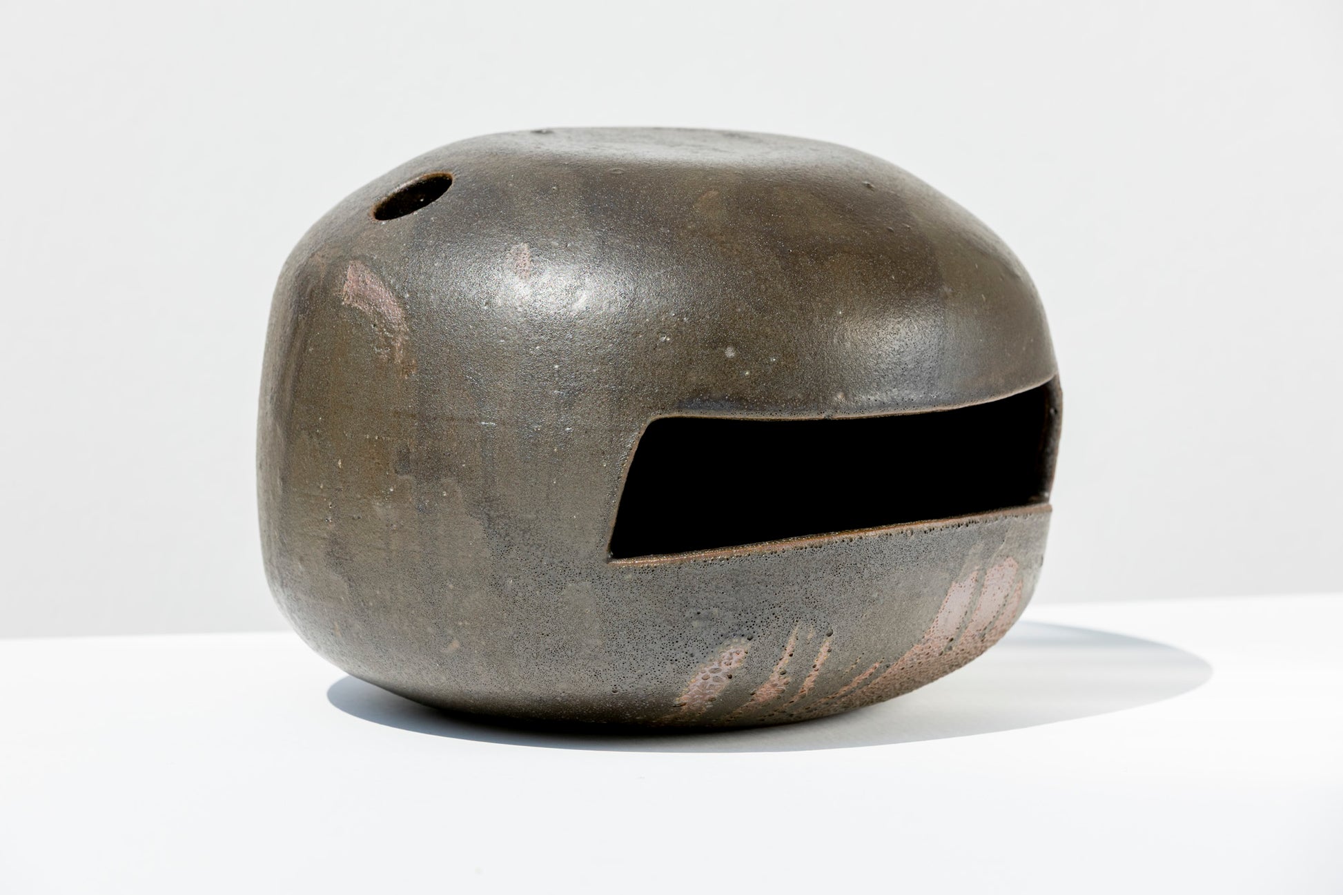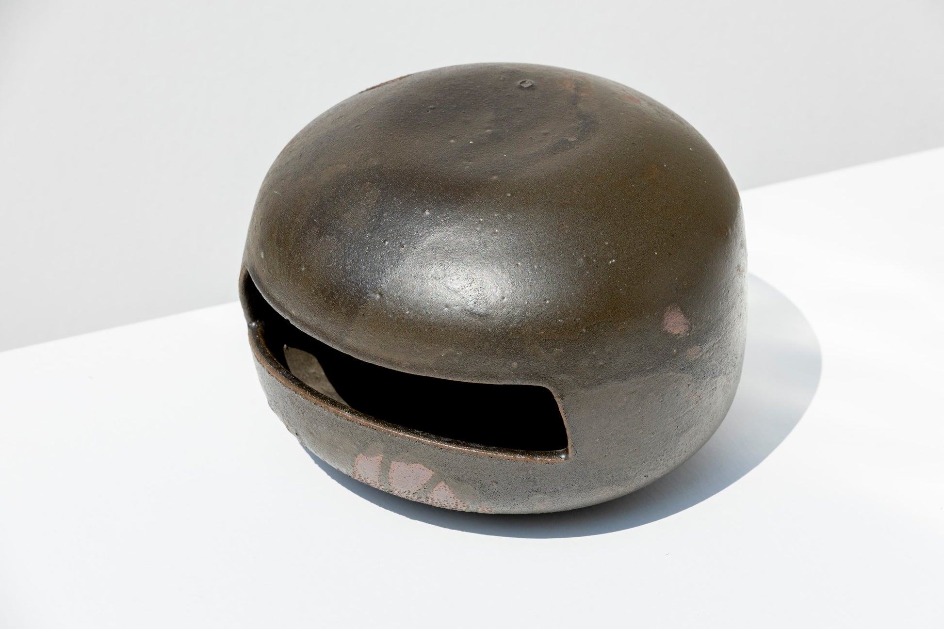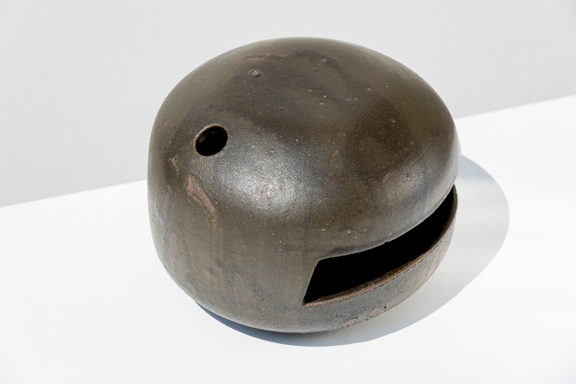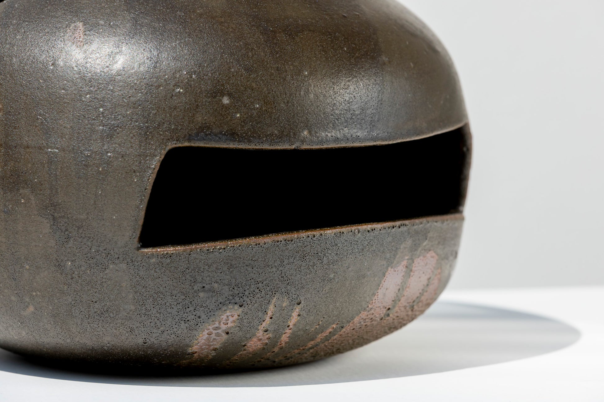 A vessel that blurs the line between function and form. This stoneware vase features a rounded silhouette punctuated by geometric openings. Its matte black glazed surface carries subtle variations from the firing process, lending it a raw, almost volcanic character.