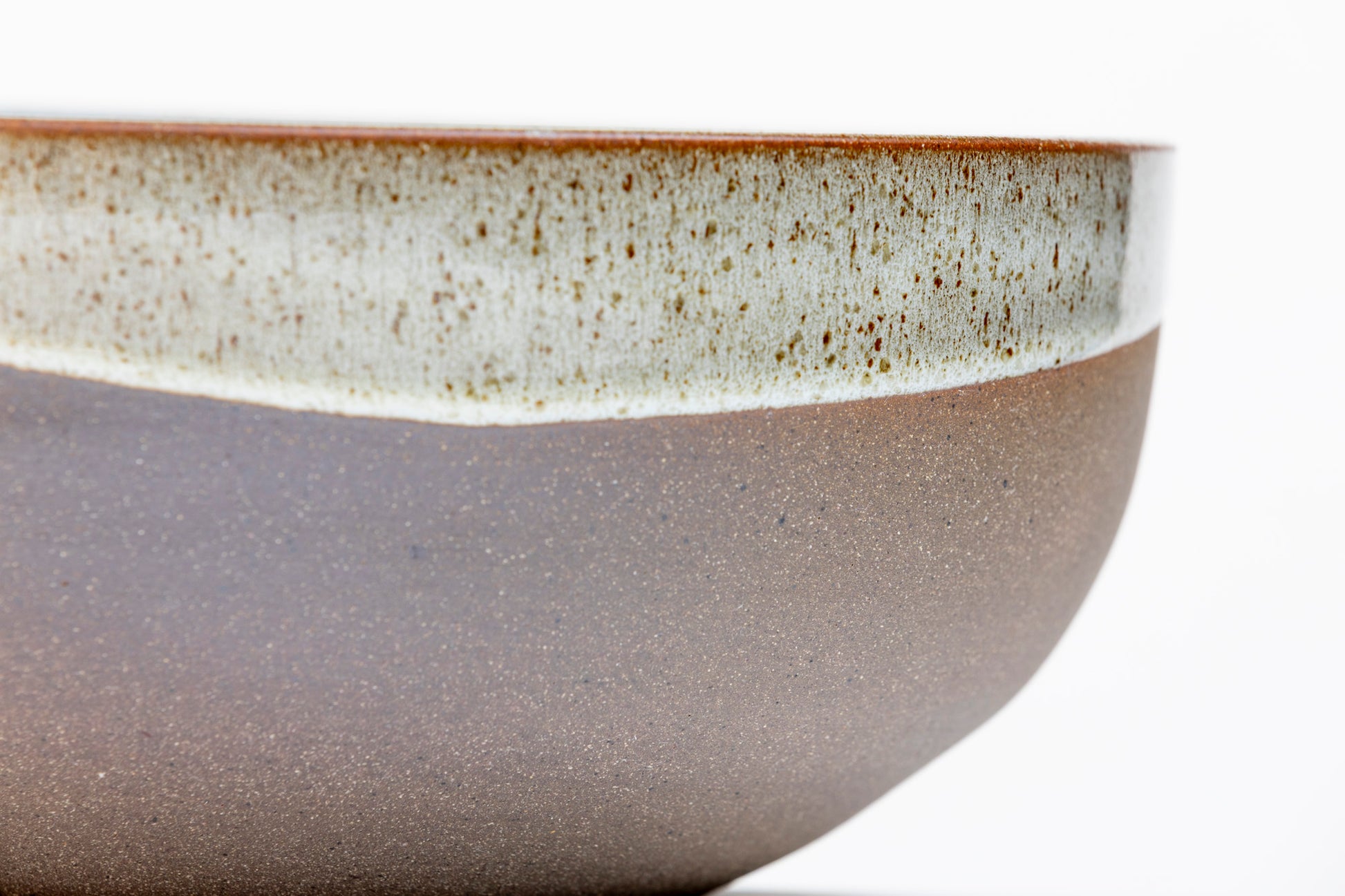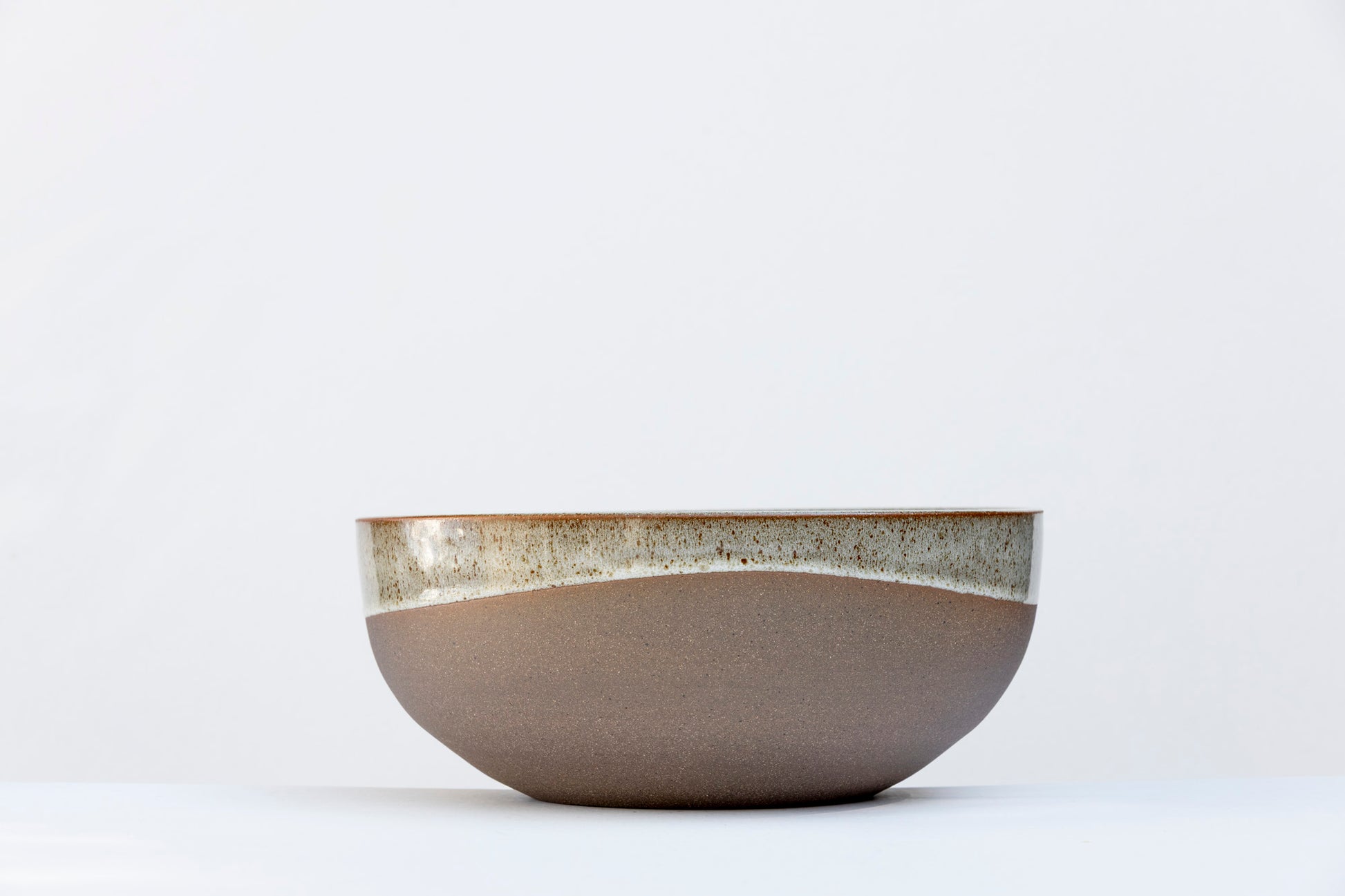 Crafted for both functional and decorative purposes, this hand-thrown stoneware bowl features a speckled white glaze interior that shows deeper earthy hues of the clay underneath. The exterior is left partially raw showing the sandstone-like clay body, for a more tactile experience. At 25cm wide, it’s ideal for salads.