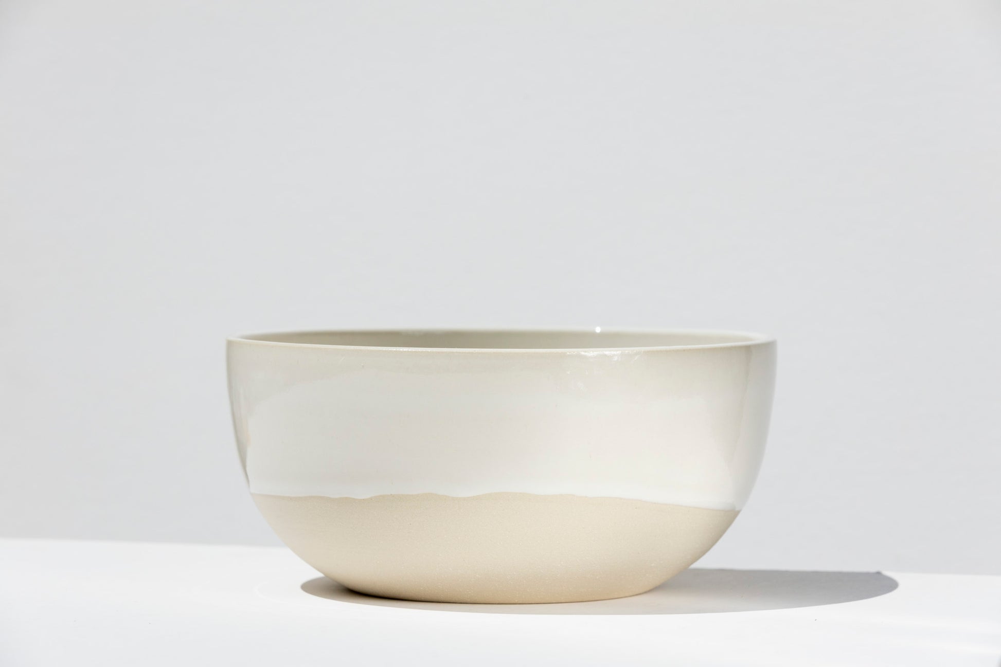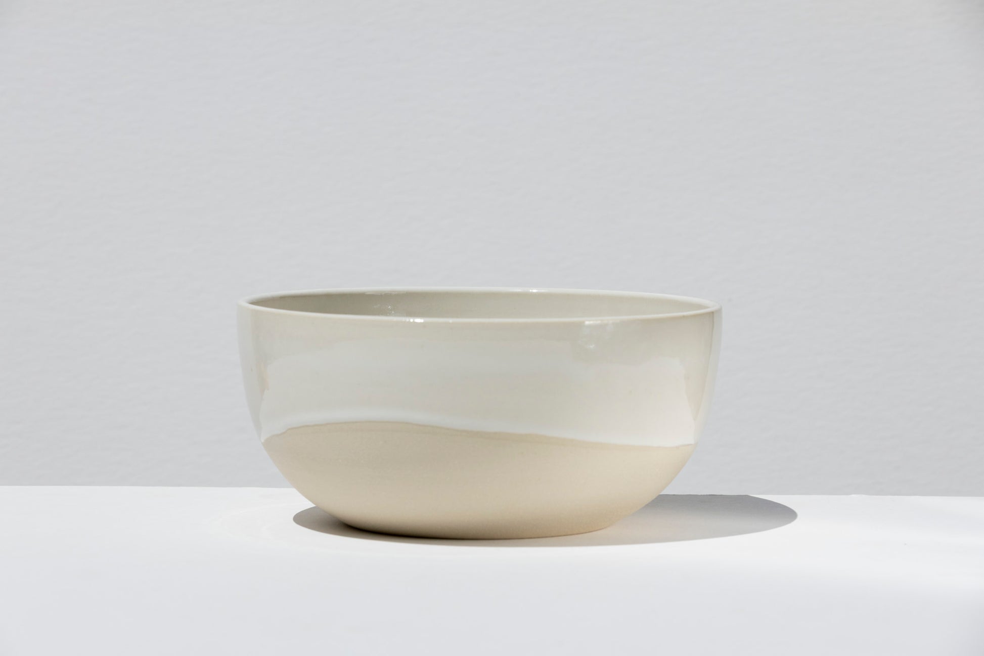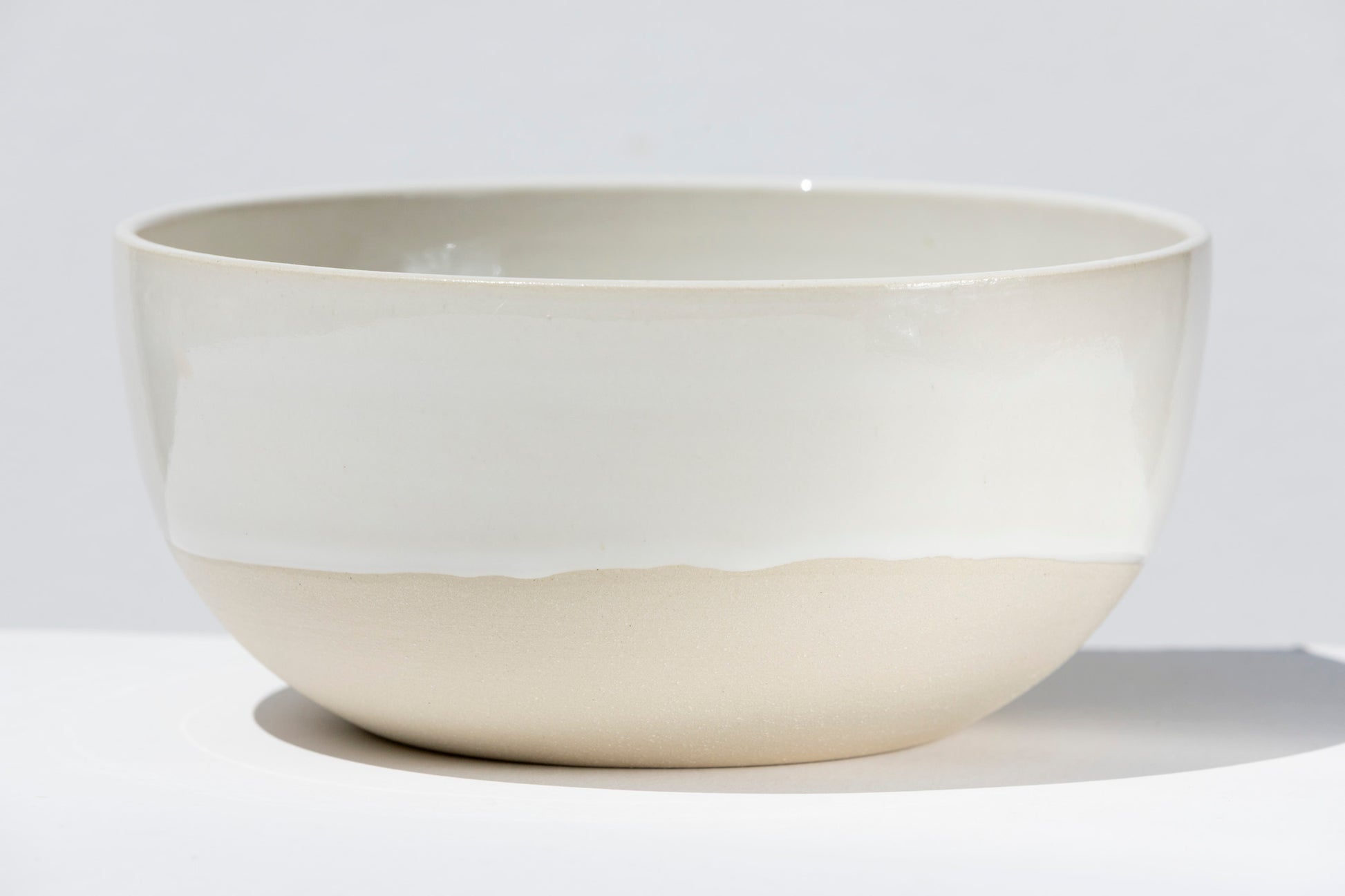 This hand-thrown stoneware bowl is a combination of soft shiny off white glaze and the textured raw clay body, offering a tactile contrast that invites touch. Its soft rounded form makes it ideal for salads or shared dishes.