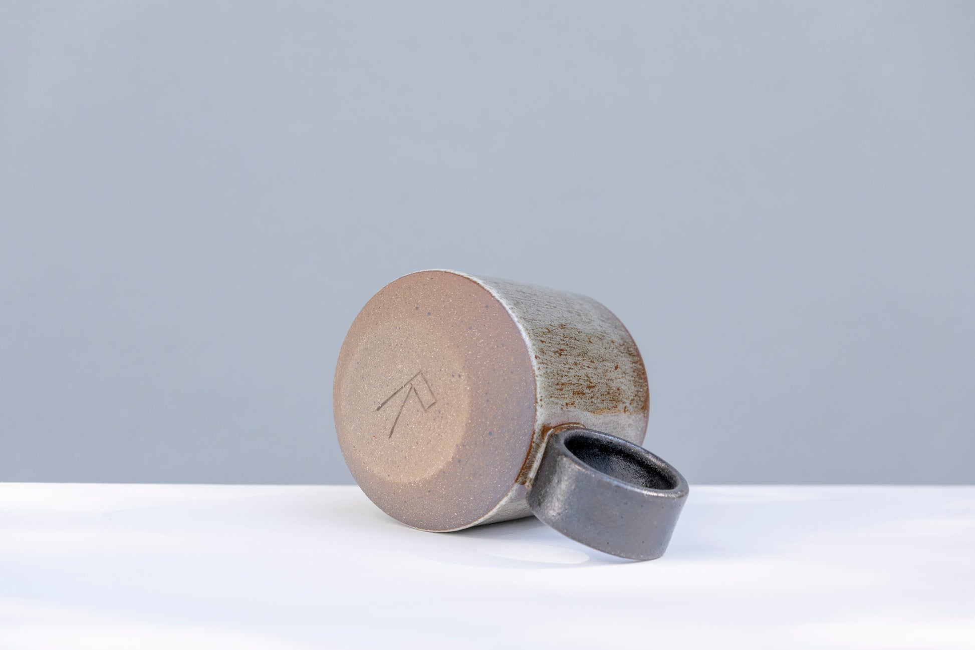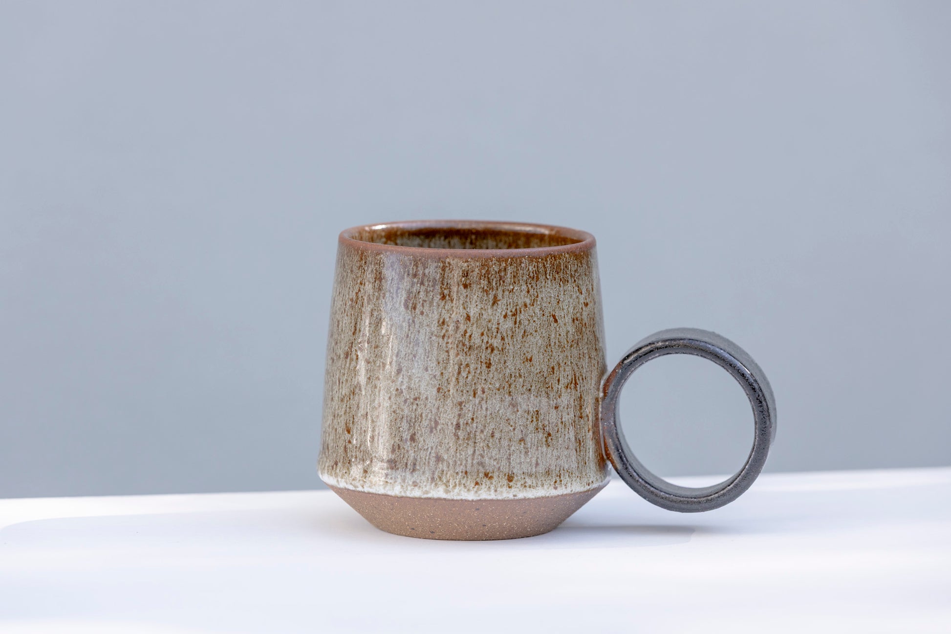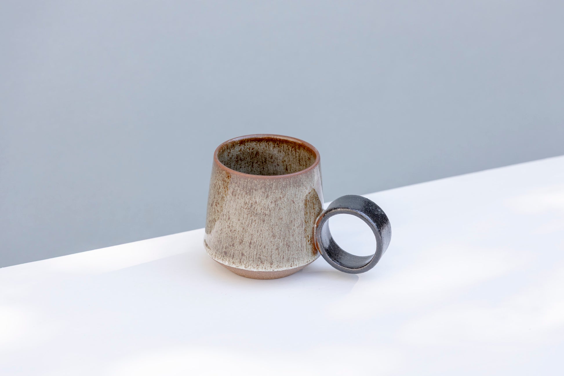 Elevate your daily ritual with this handmade dual glaze mug. This mug is decorated with shiny speckle white glaze on the body and matte black glaze on the looped handle. It's a unique piece is ideal for Lattes or cappuccinos that blends artisanal tradition with contemporary flair.