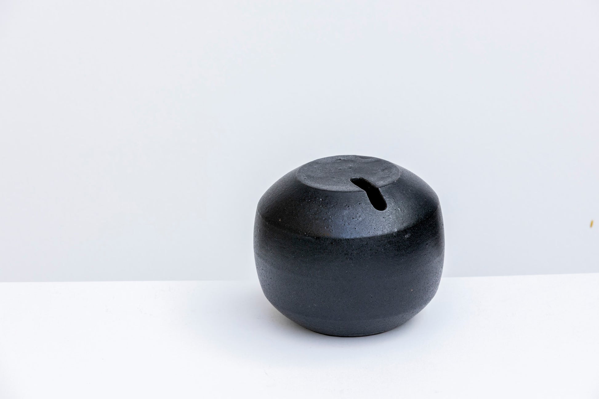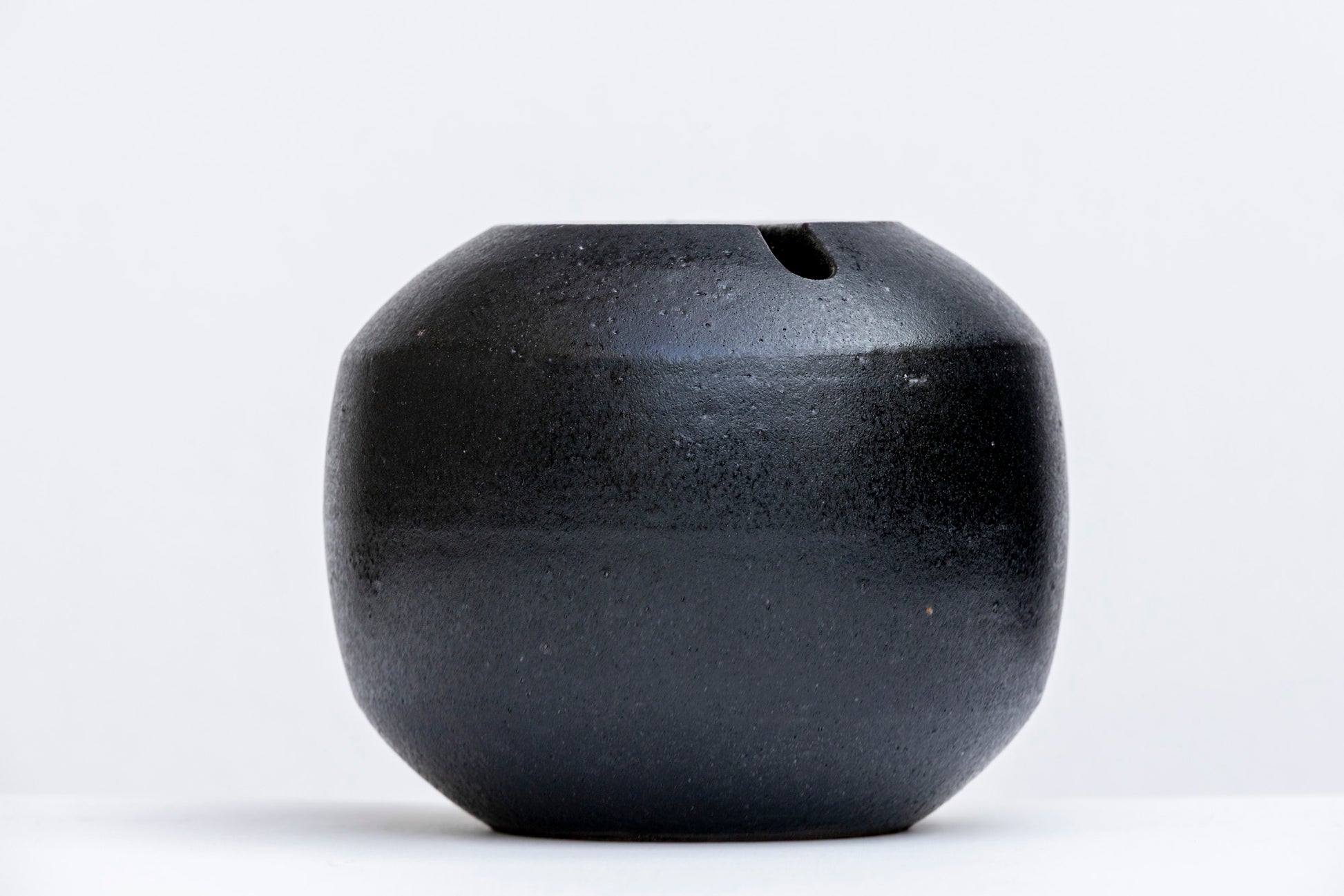 This hand-thrown minimalist vessel is shaped in a slightly round, beveled silhouette and a narrow slot opening, suggestive of something architectural. The matte black glaze absorbs light, perfect for displaying a unique flower arrangement.