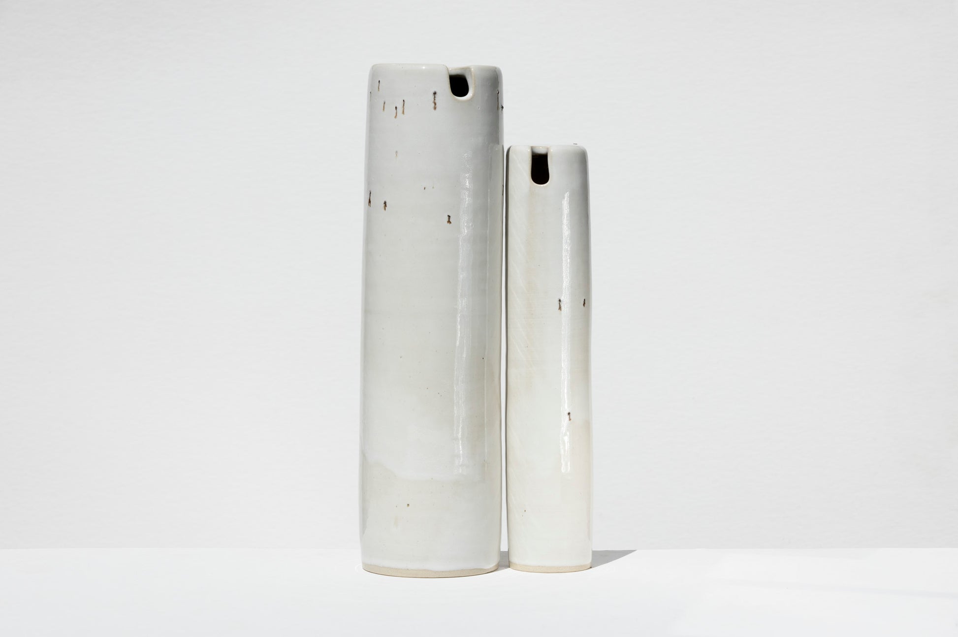 A study in quiet elegance, this pair of tall white vases embodies the essence of minimalist design. Each piece is wheel-thrown by hand and finished with a smooth, luminous white glaze that catches and reflects light beautifully.