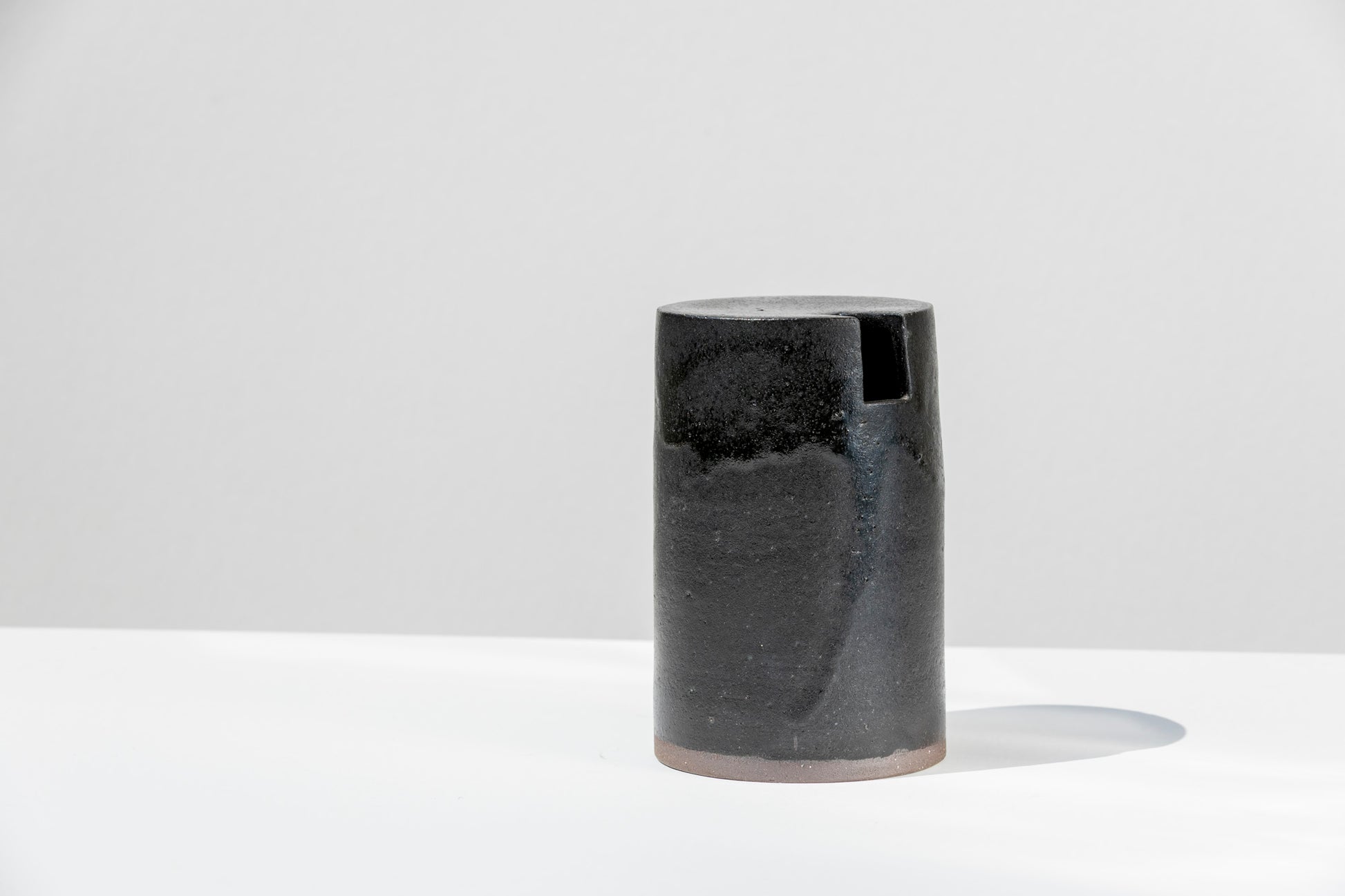 This vase stands 14cm tall with a cylindrical, architectural design, and finished with a smooth yet subtly textured matte black glaze. A rectangular mouth adds architectural intrigue, making it as much a design object as a functional vessel.