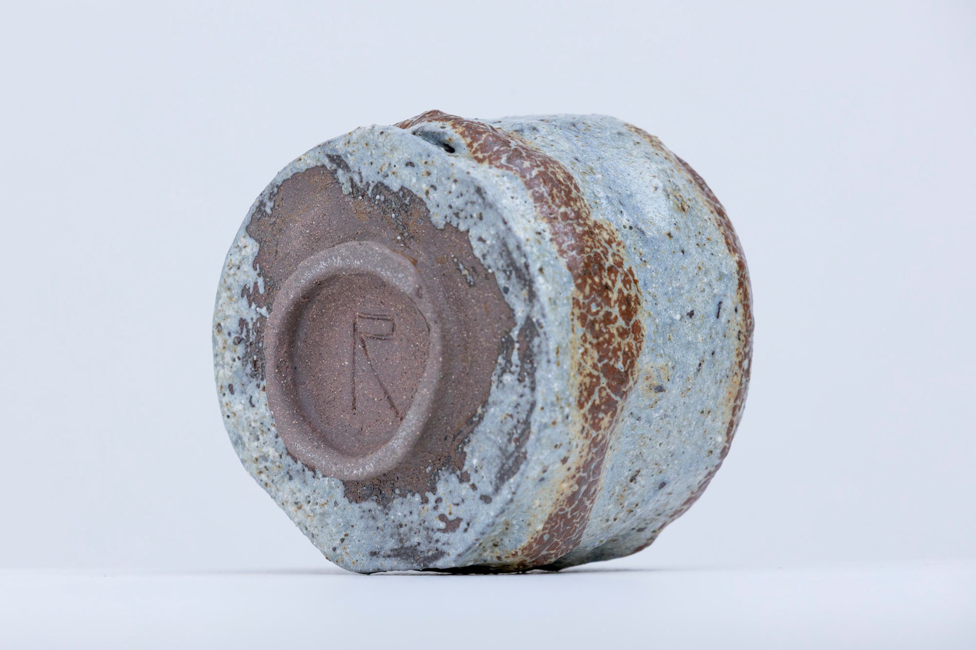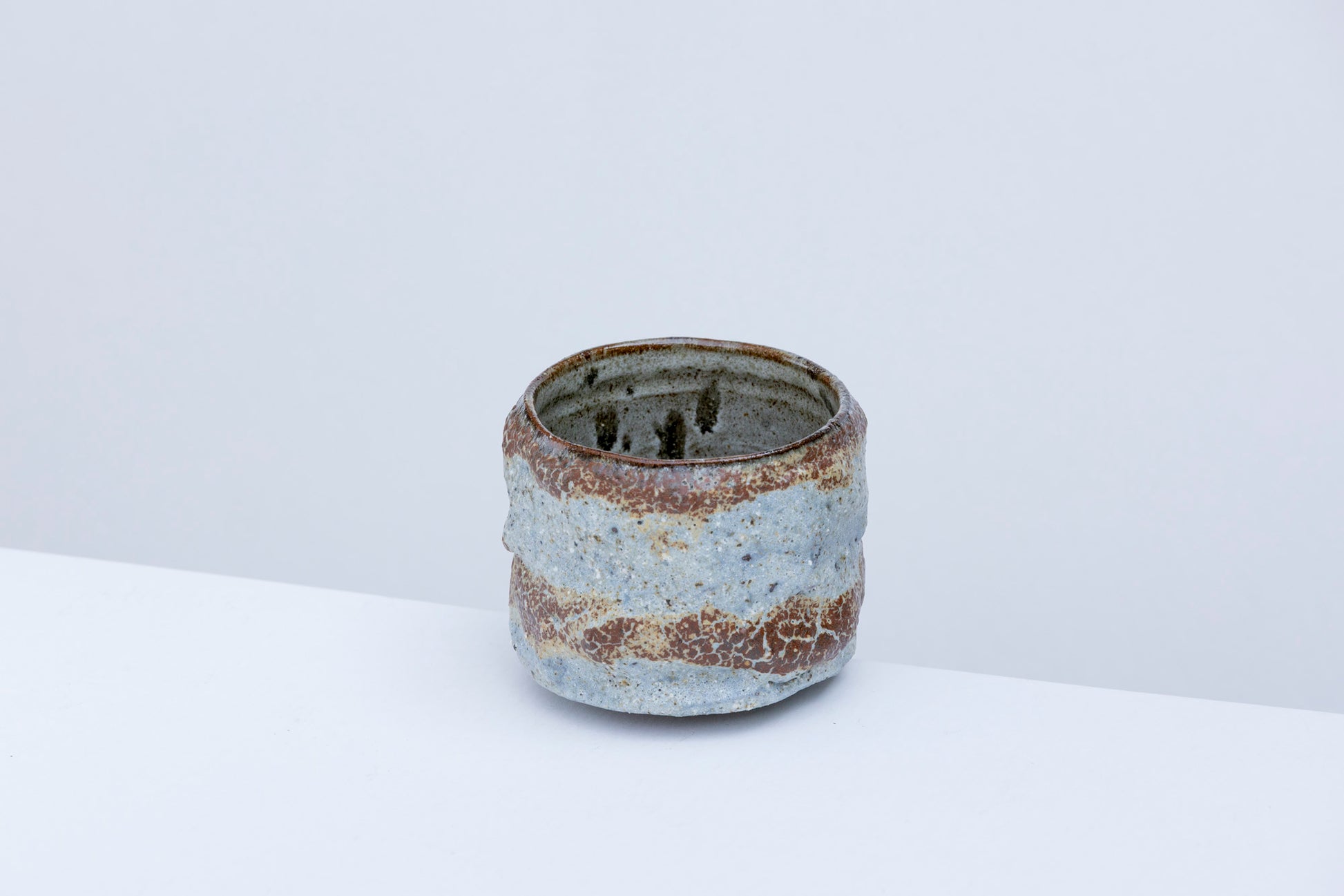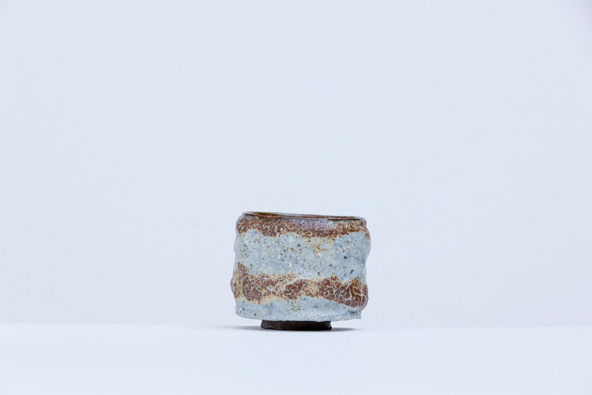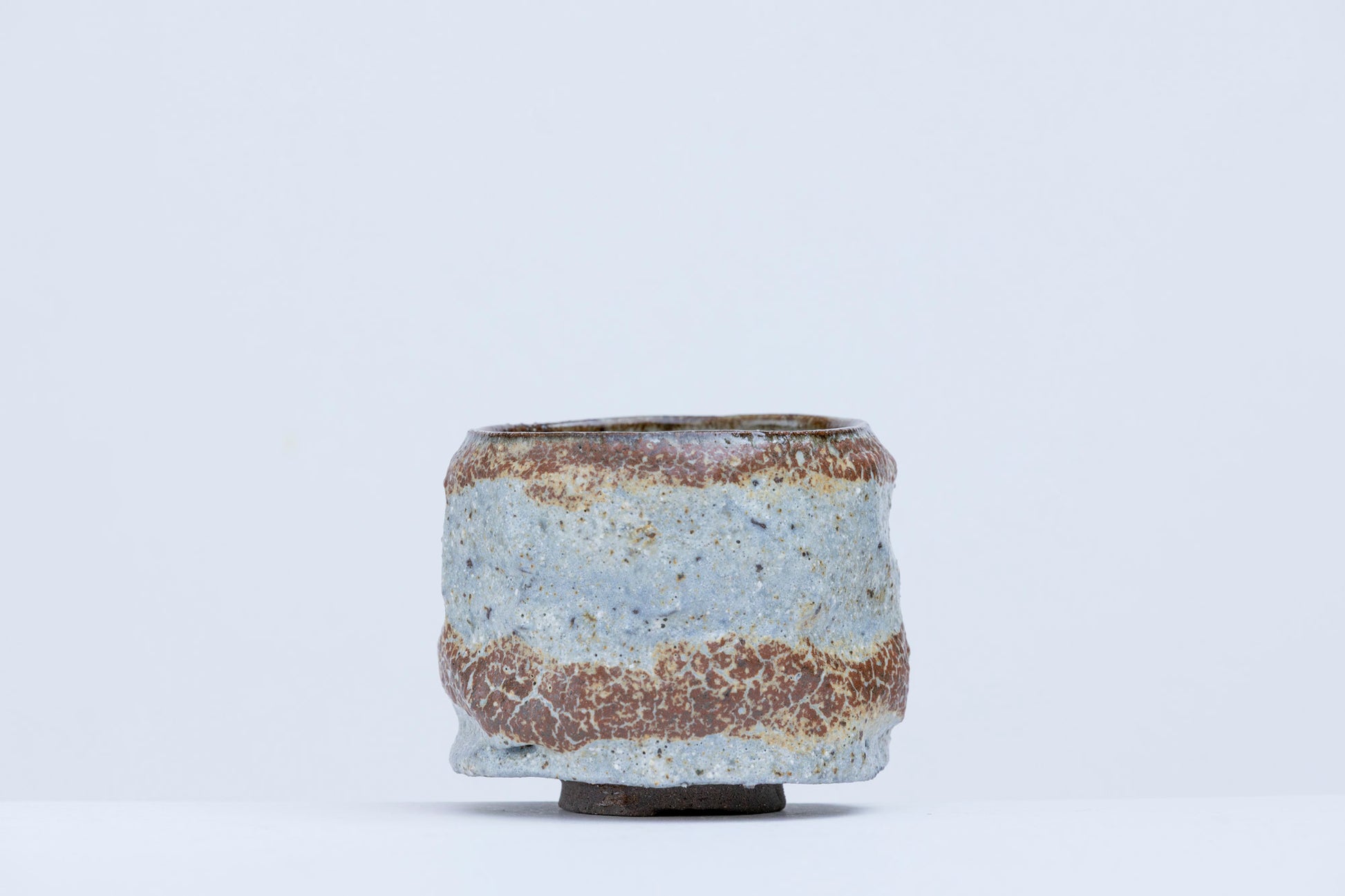This hand-thrown tea bowl blends earthy brown with pale blue-gray in a layered, crackled ash glaze that evokes weathered stone. Its cylindrical carved form is subtly irregular, with a surface that invites touch—rough in places, smooth in others, like a landscape shaped by time.