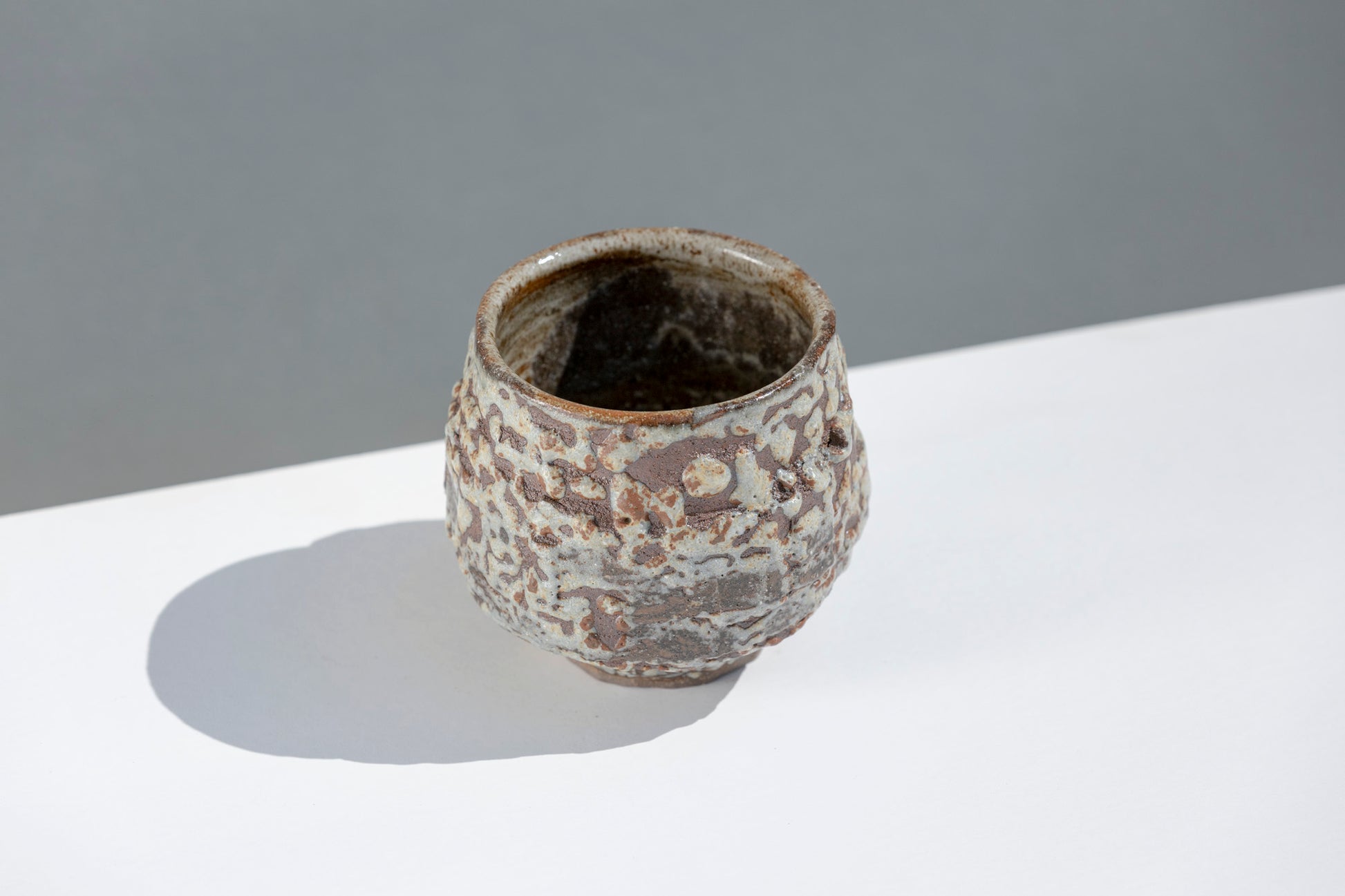 Elevate tea time with this wheel thrown carved tea bowl decorated with ash glaze. Expertly handcrafted from locally sourced clay and fire to stoneware temperatures, it blends wabi sabi uniqueness with everyday durability.
